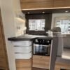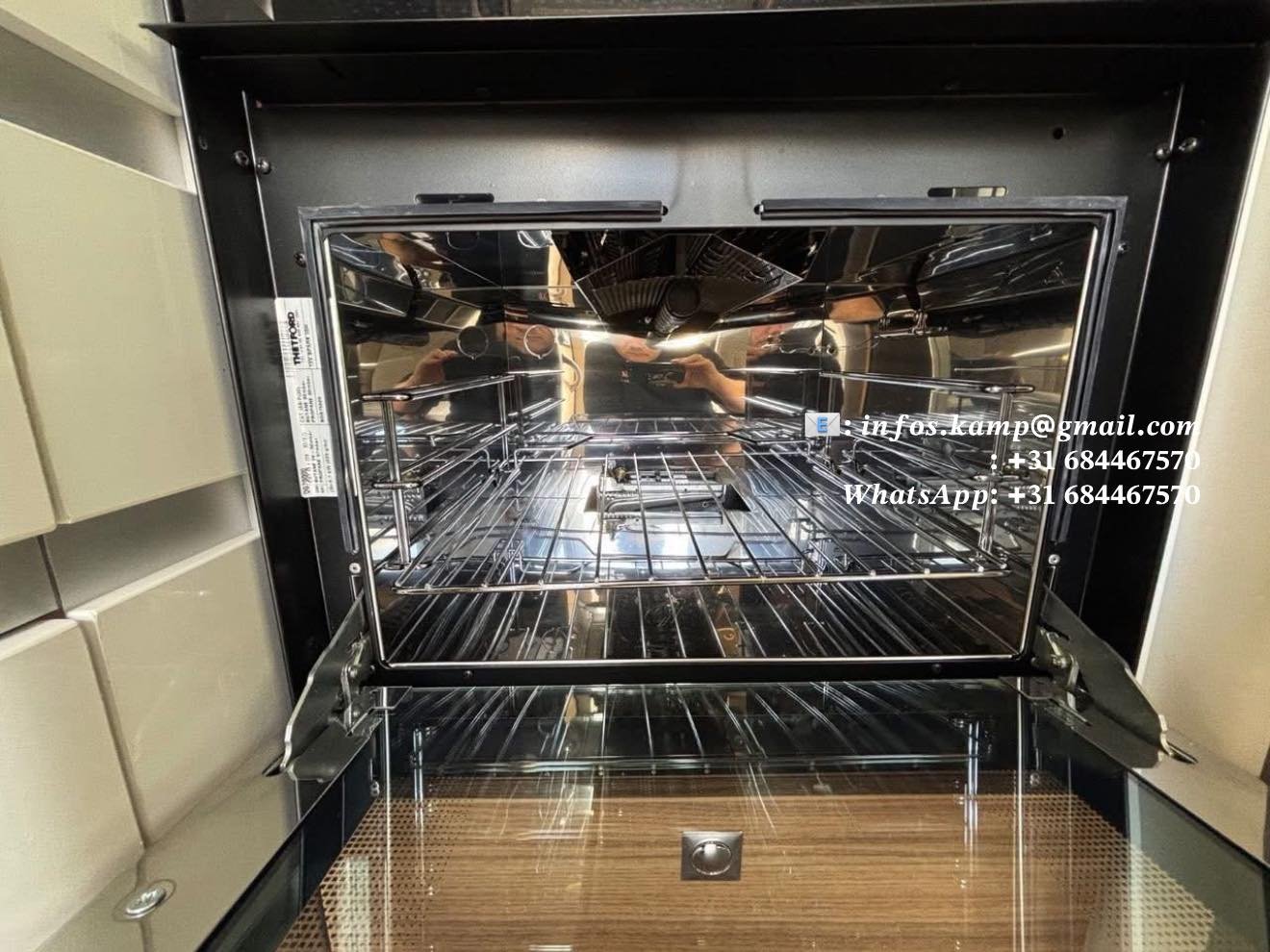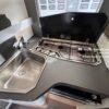 Cuisine équipée : four à gaz, ventilateur de cuisine, grand plan de travail