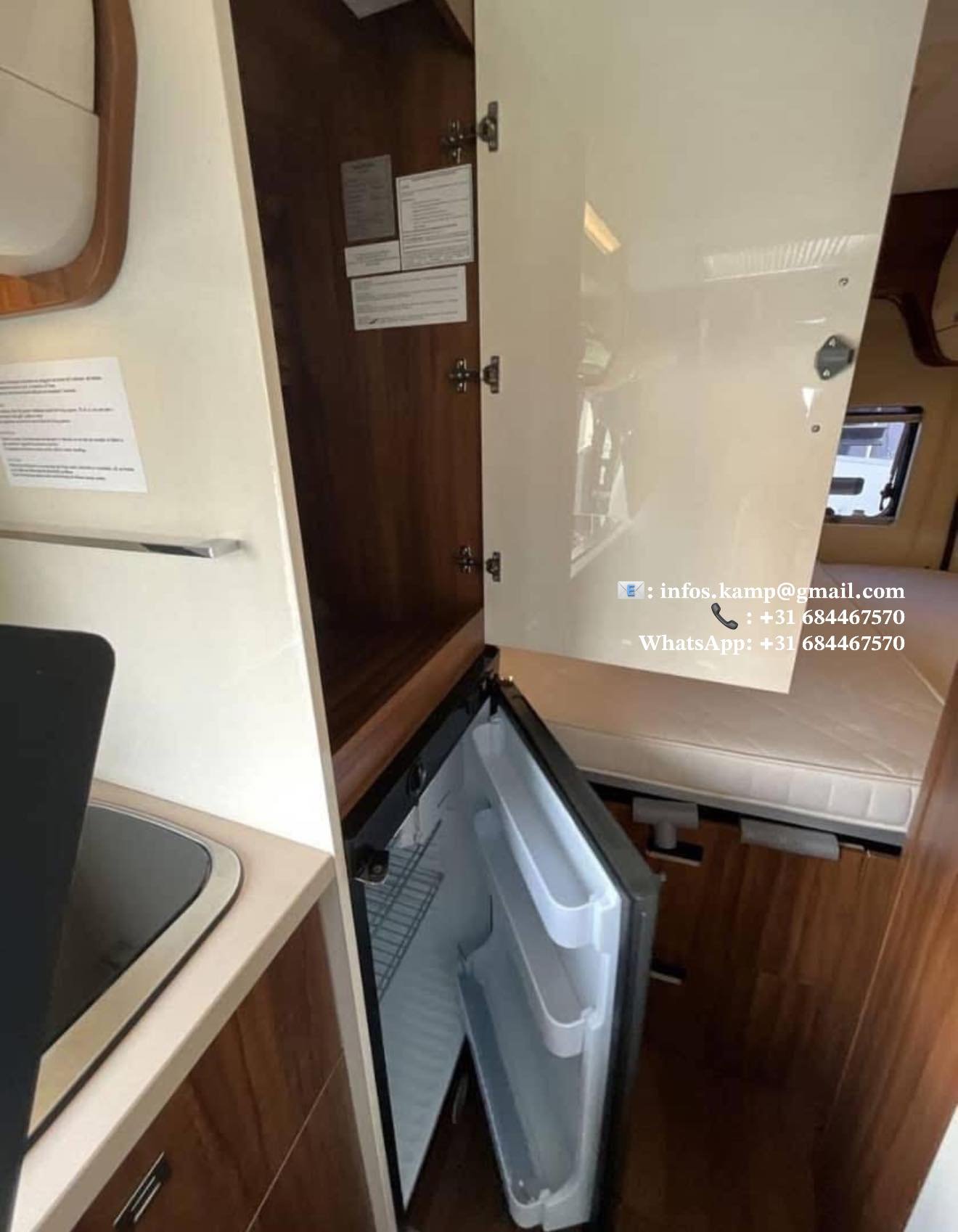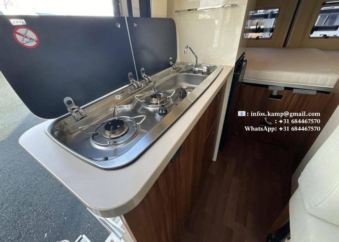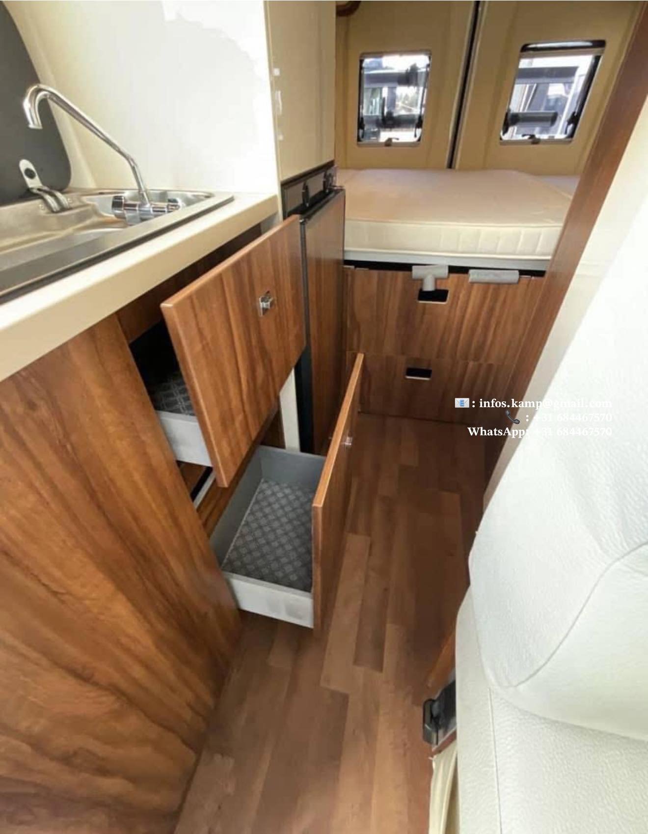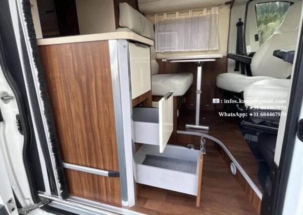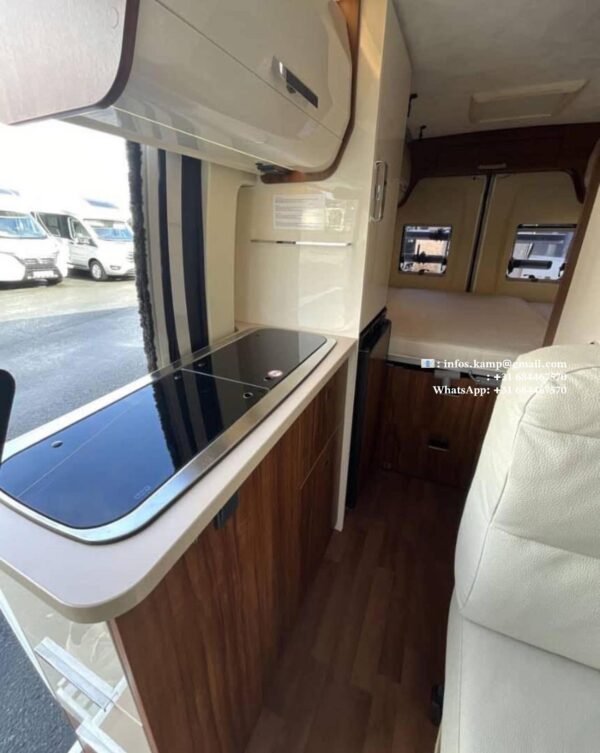 Cuisine avec 2 feux, évier, 5 tiroirs, réfrigérateur Dometic avec freezer, grand placard